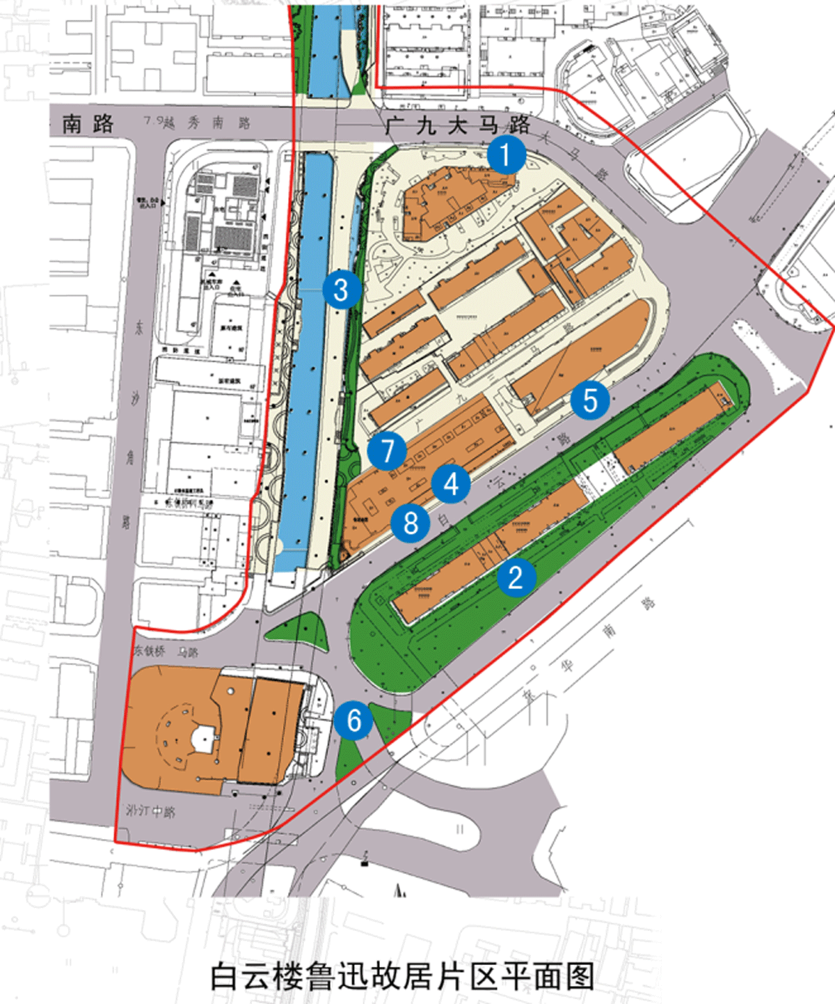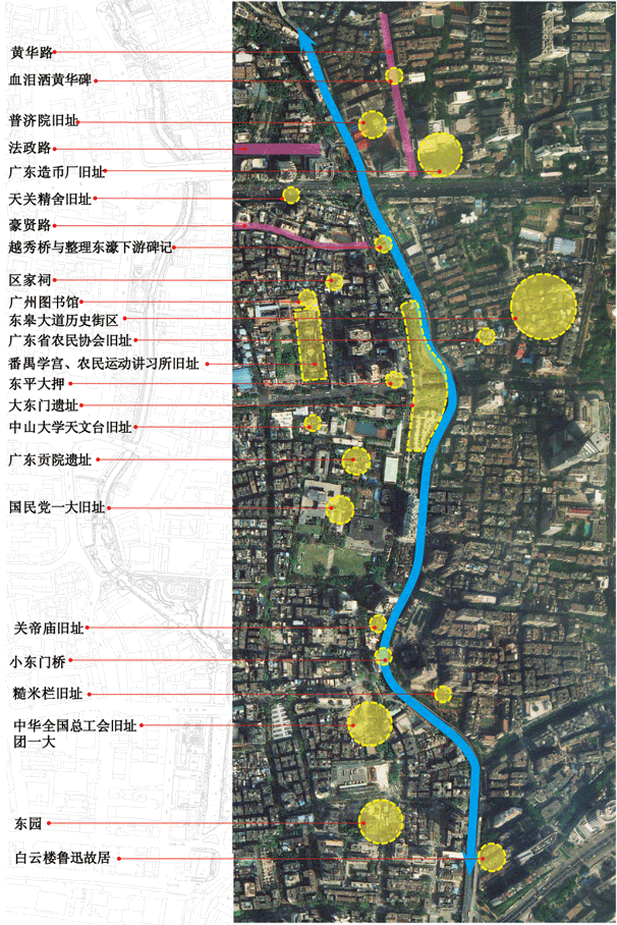 区域人文荟萃——大东门、贡院、番禺学宫、鲁迅故居、中华总工会旧址、国民党一大旧址、团一大广场等交织错落,构成丰富历史文化及空间资源。