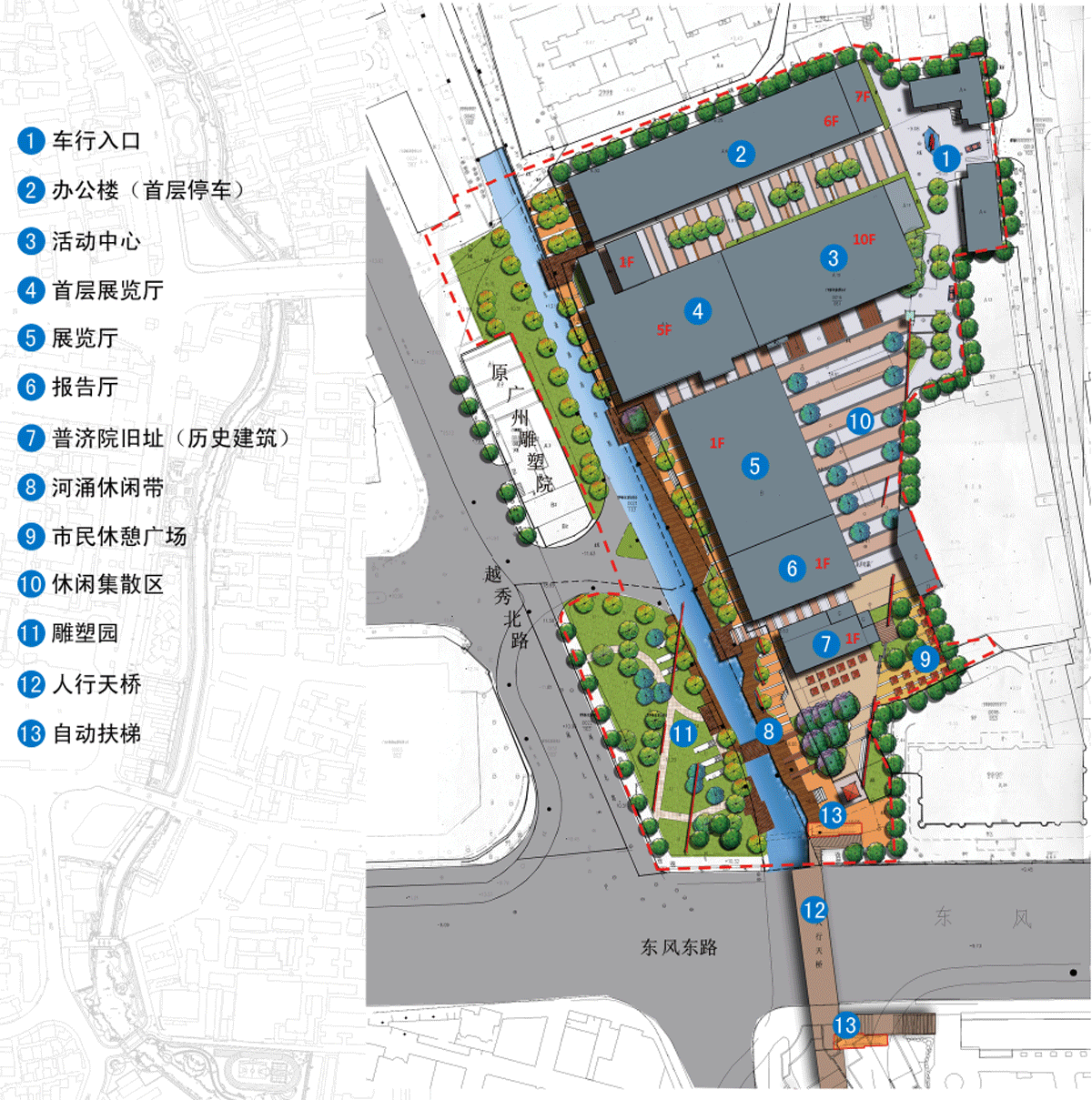 保留并修缮清末普济院旧址,对南洋电器厂厂房、库房等进行综合改造和利用,将园区改造成“东濠涌印象园”。整合广东雕塑院空间场地和艺术资源,加强与东濠涌南段的空间联系。