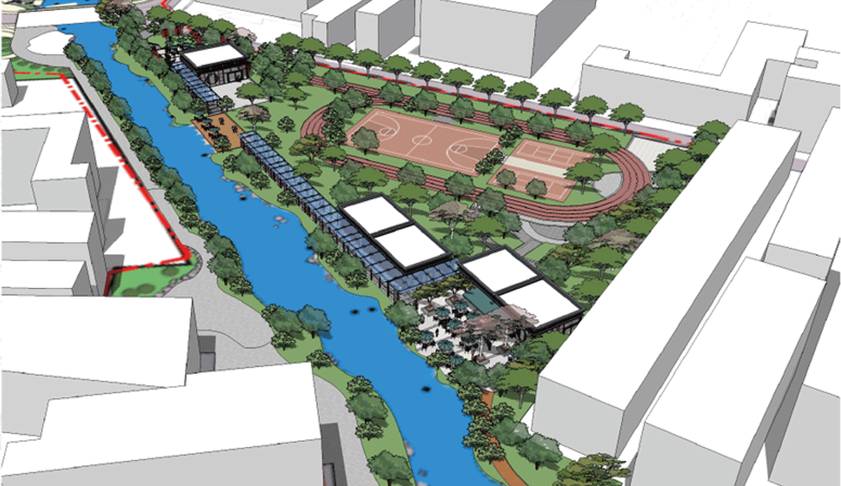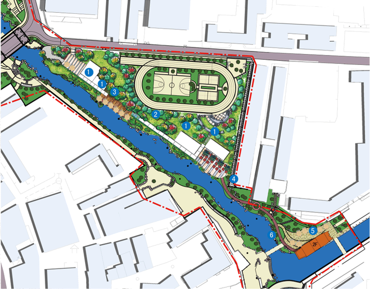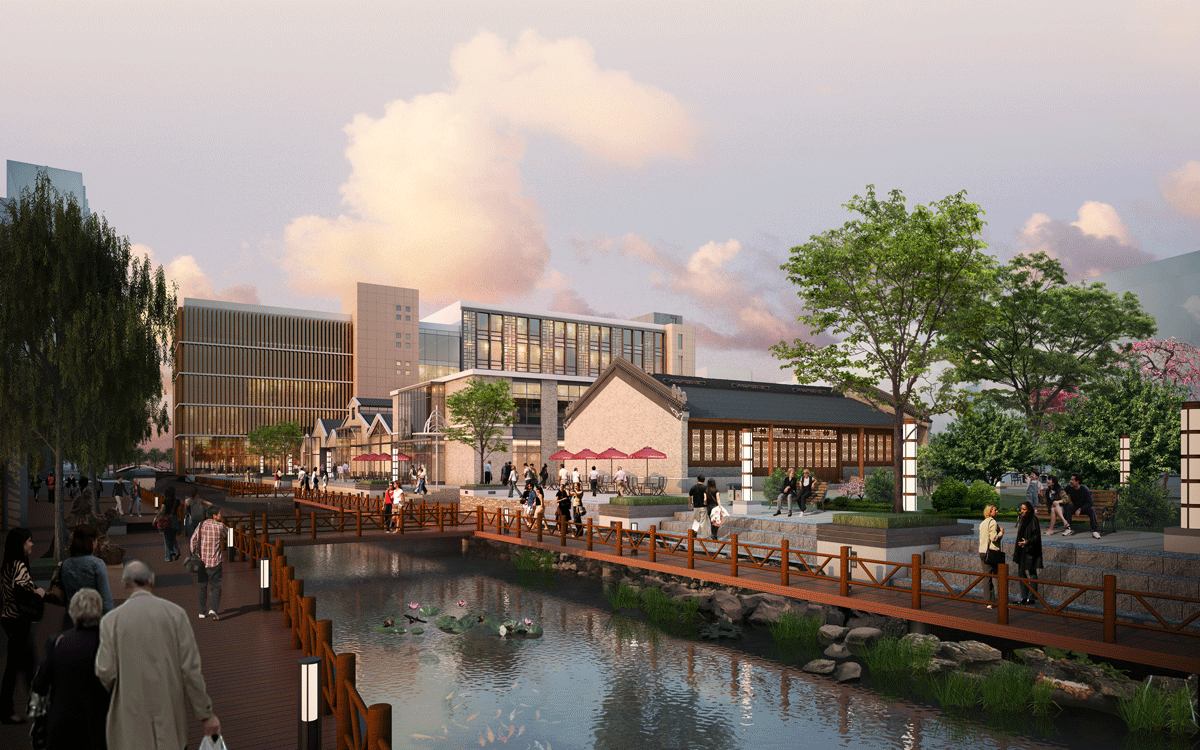 植入文化休闲功能,植入清吧、茶座、艺术长廊、亲水平台等文化休闲设施,加强东濠涌与周边记忆节点(如东园、白云楼)的空间联系。