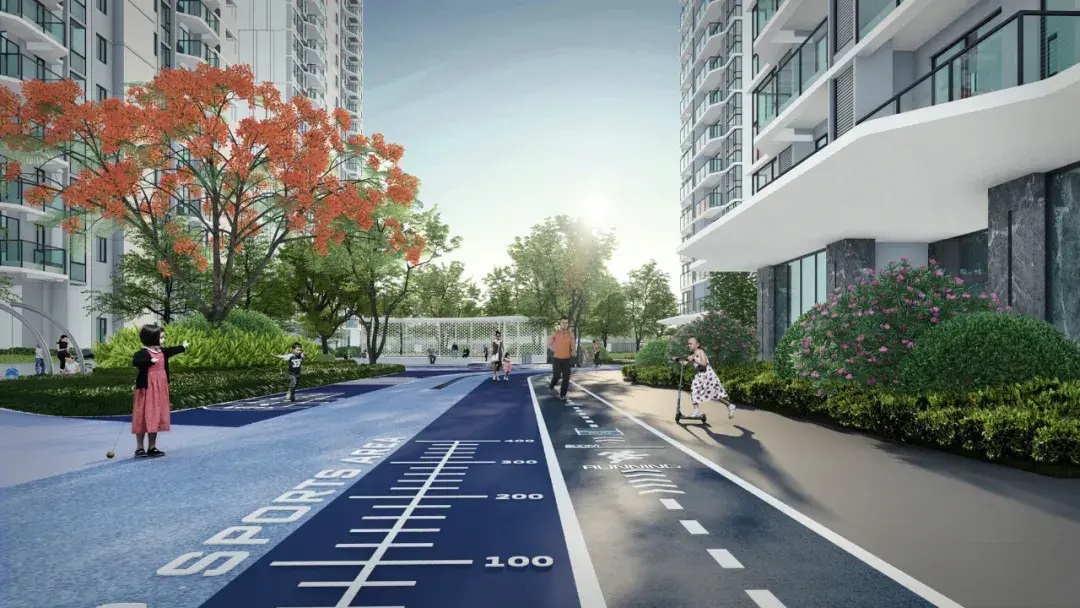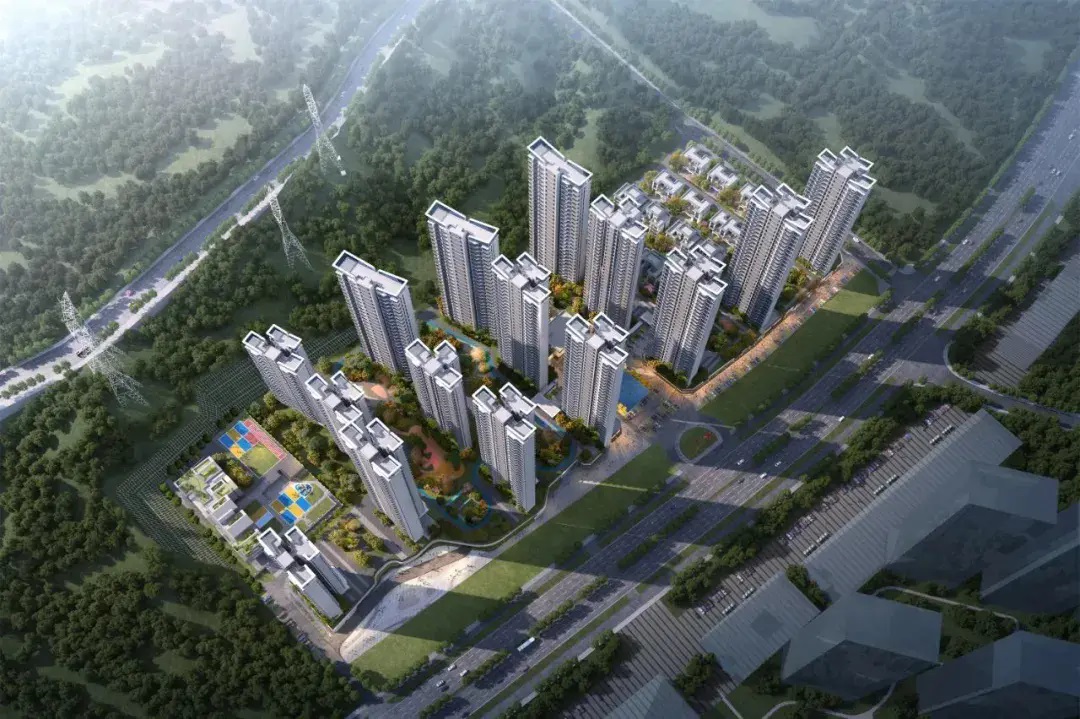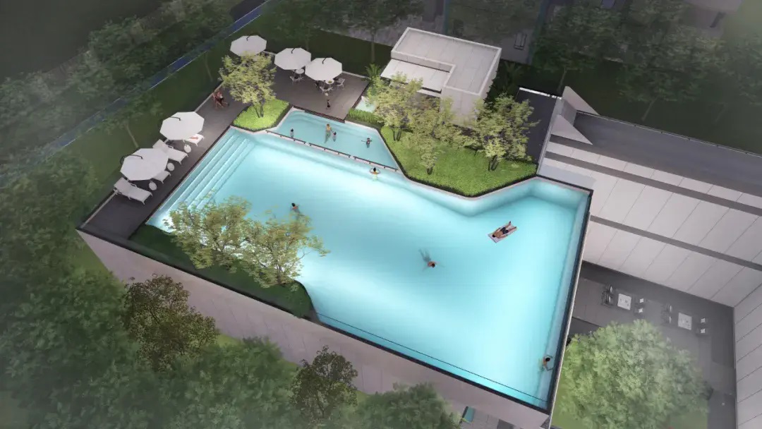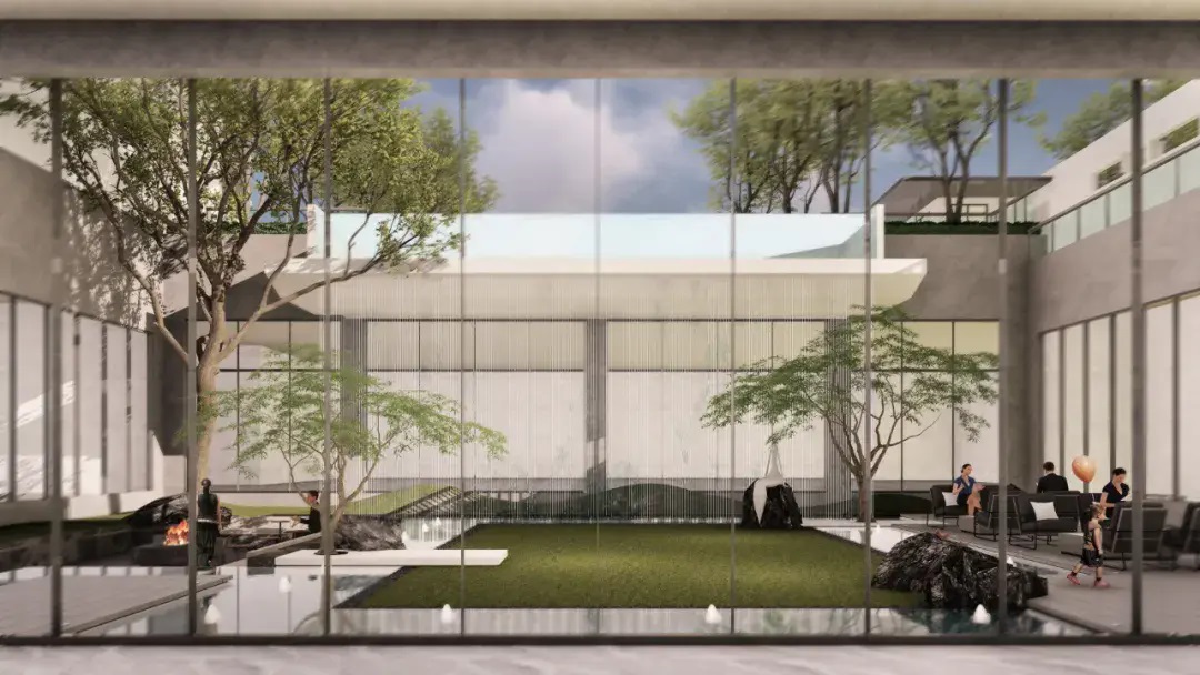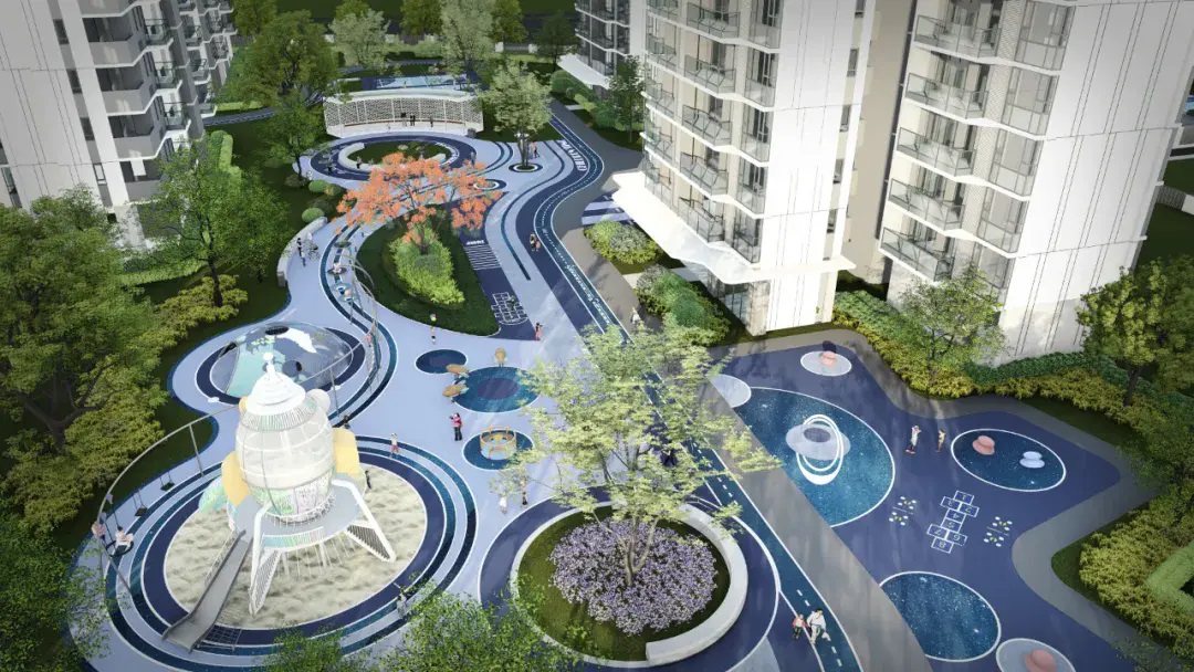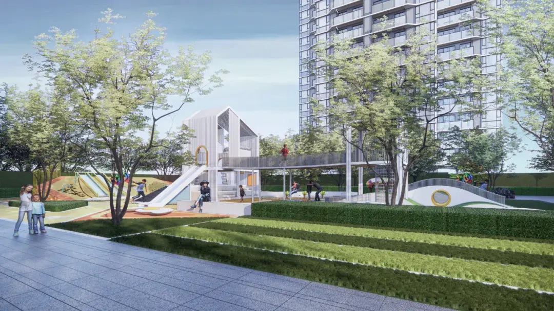 项目景观规模达到6万多平方米,分布有广场、中庭、屋顶泳池、宅间绿地等各类空间。景观结构为“一轴、两环、八园”。以林造景,灵感来自于自然林境中的山、水、林、舍、廊、树屋、花园、星空等自然场景,映射八大林下空间,诠释社区美好生活场景。