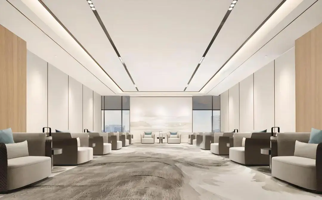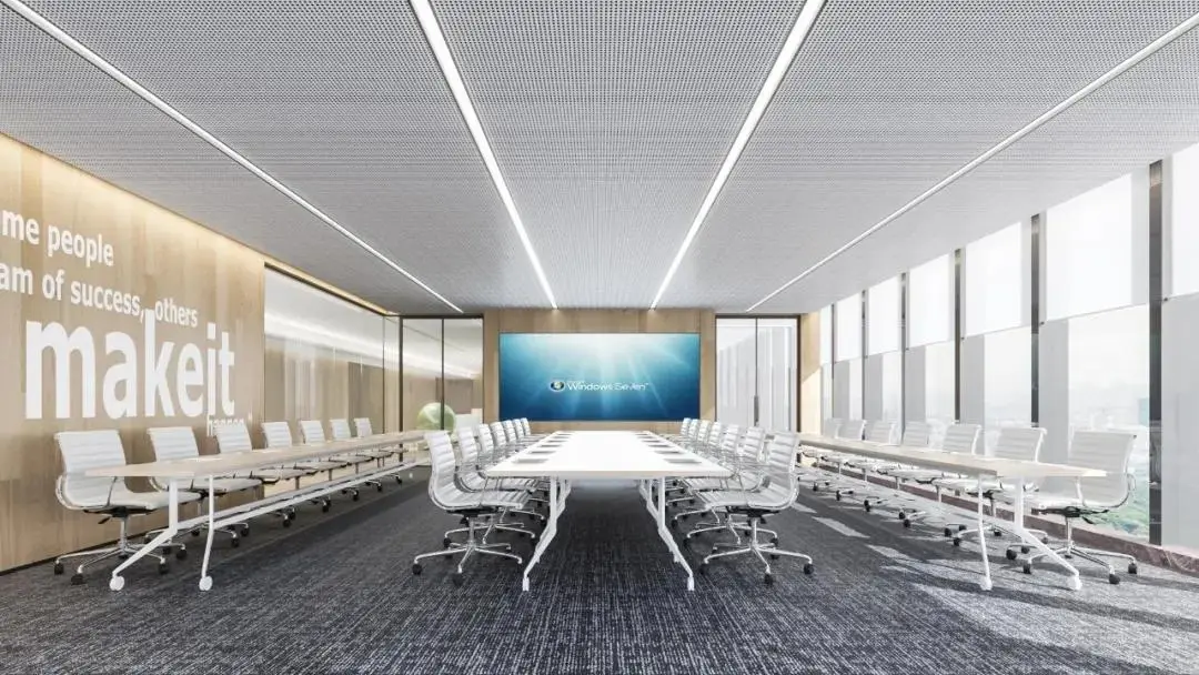 会议室以能源矩阵为主题,通过大面积的窗户,将室外的自然光引入室内,确保了足够的空间感。原木背景墙和质感地毯,给人温润与柔和的感觉。灯具的挑选同样注重实用与美观的结合,让员工在工作时不会感到压抑。