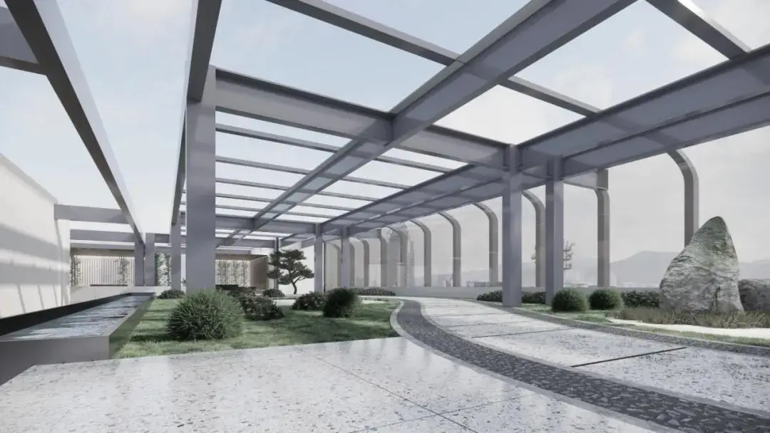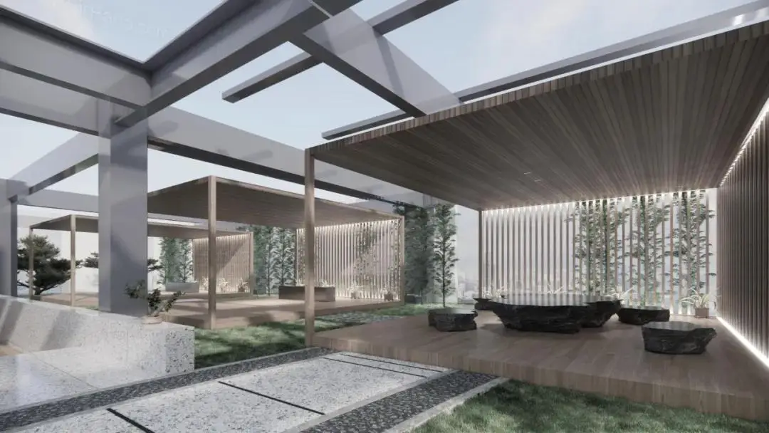 22层天台,设计运用借景入室的手法,将中国传统山水景观引入空间。通过置水理石,营造休憩亭台,将景观、自然、空间融为一体,借此调节办公区域紧张的氛围。设计所映射的,是未来办公中对自由、轻松、愉悦的精神诉求。