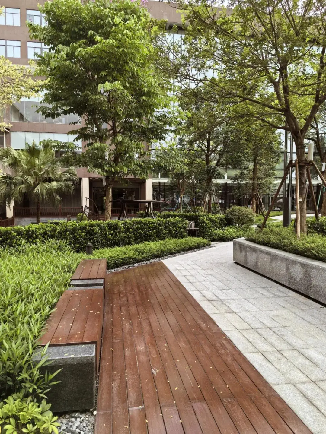 植被与坐凳的穿插激发了游客的自然停留意愿。或坐憩或经行,观郁郁树荫,听潺潺跌水,闻淡淡花香,舒缓了办公人群的压力情绪,也提升着场地的活跃度和参与度。