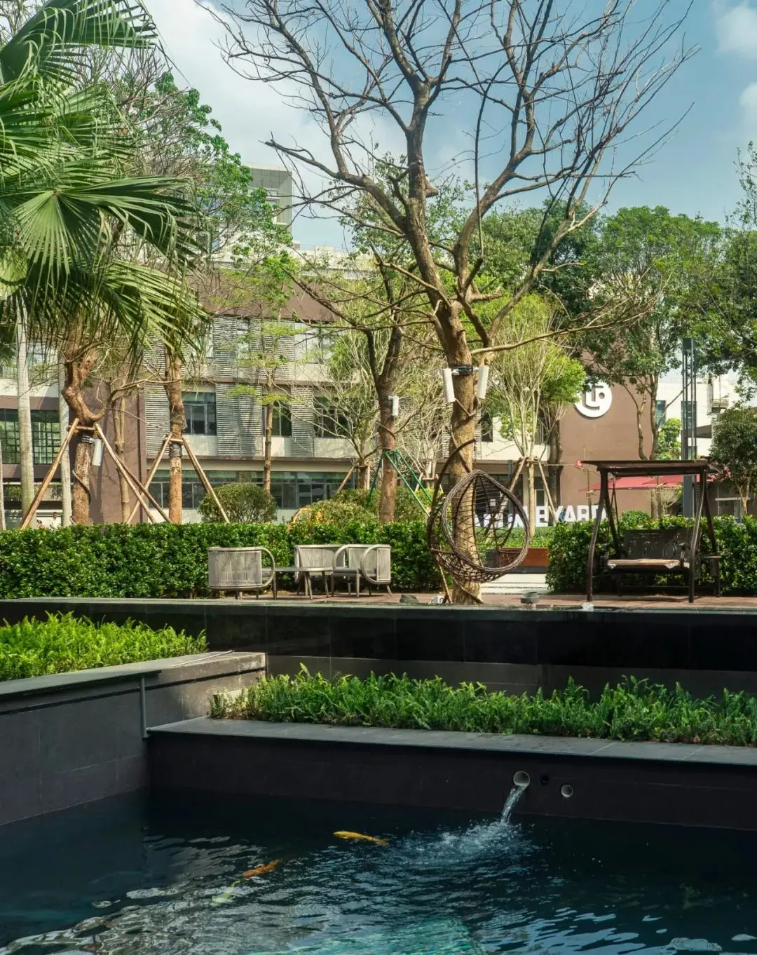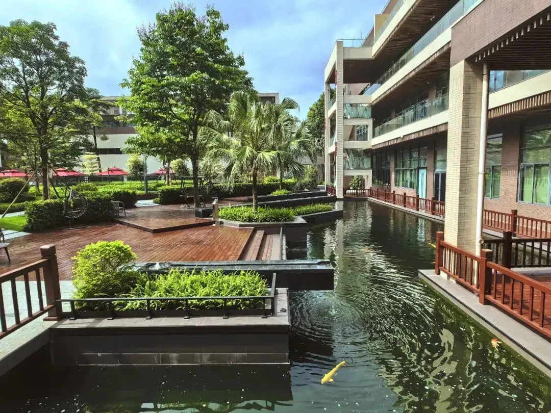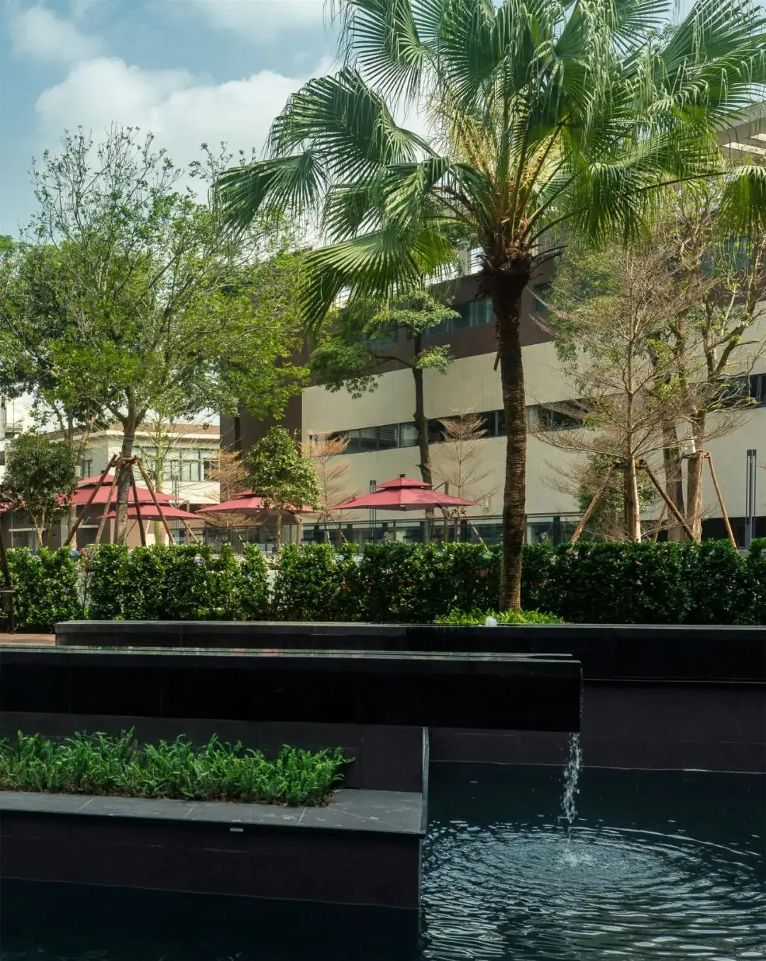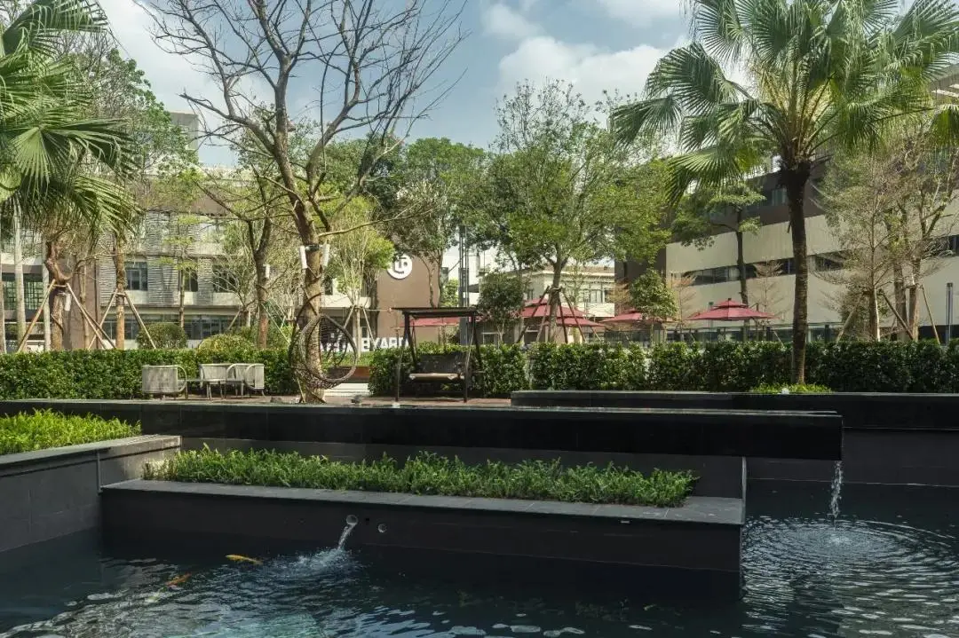 景观设计延续了建筑的布局形态和结构线条,简洁清晰、方向明确,以水、石、木等自然元素的融汇呈现主题氛围,移步异景,邂逅生机。