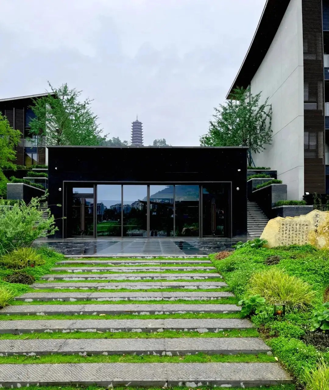 设计以山水为依托,构建「水可鉴心,山能养志」的精神归宿。取材金属格栅、中空玻璃、清水混凝土和当地石材,以「减法设计」凸显材质本真。