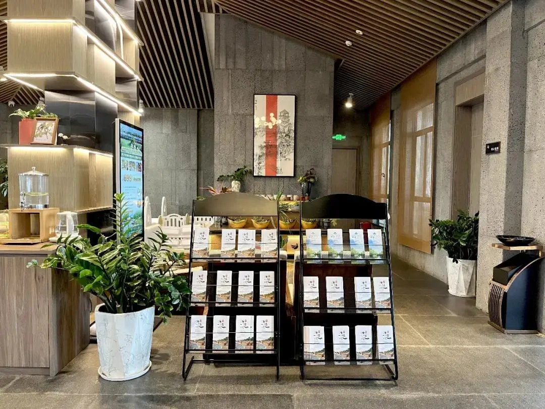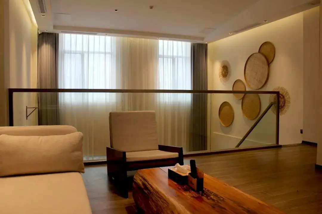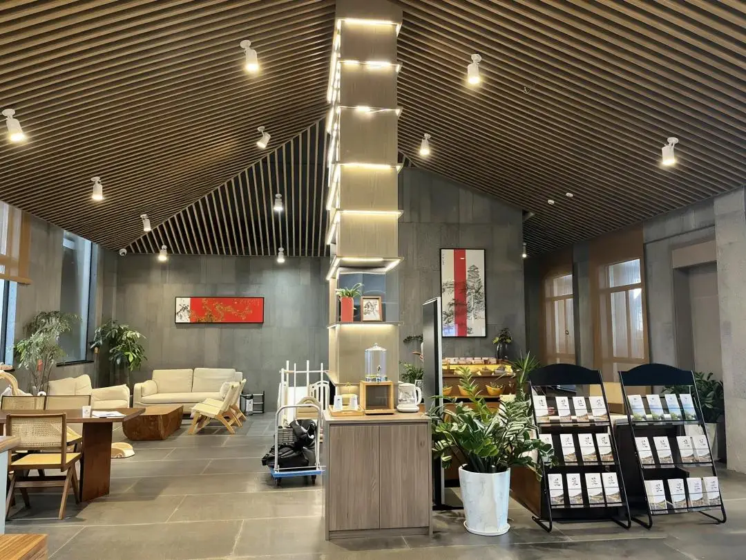 大堂设计借助古木船、草帽、渔具等地域文化元素,带人回归古渔村生活场景。吊顶采用木格栅,微妙的角度变化在大堂上空形成了一条优雅的弧线,格栅之间隐约可见建筑的原始结构。同时,空间塑造上力求质朴舒适,呈现给客人一种追古溯源般的心灵归隐感。