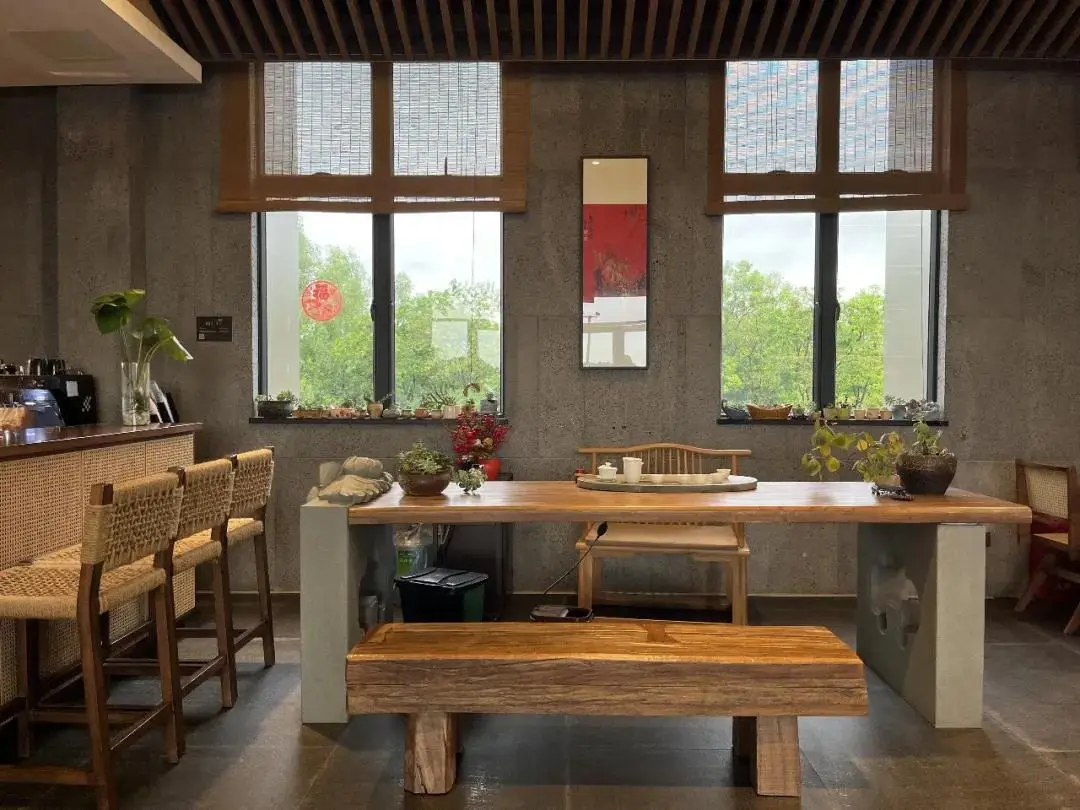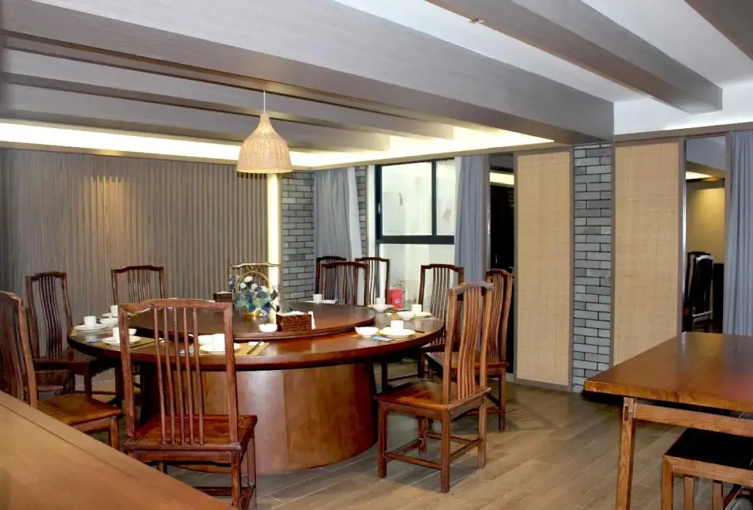 餐厅空间以水磨青砖、木饰面和布艺墙作为主要材料,设计尝试将自然肌理、匠人手工、现代科技三者相结合,寻求一种内心与视觉的双重享受,形成空间的序列感。并以古木船、草帽、渔具等元素点缀空间,回应了场域精神。