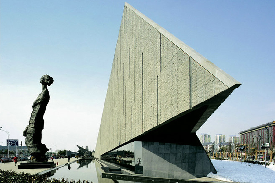 侵华日军南京大屠杀遇难同胞纪念馆突出遗址主题,尊重原有建筑,塑造整体氛围,以战争、杀戮、和平三个概念组成总体构思,由东向西顺序展开,相对应塑造了“断刀”、“死亡之庭”、“铸剑为犁”三个空间意境,形成完整空间序列。