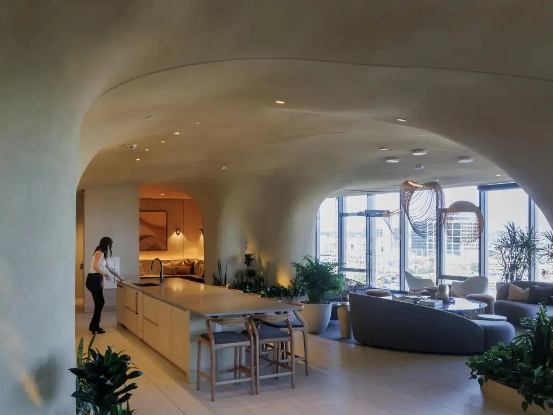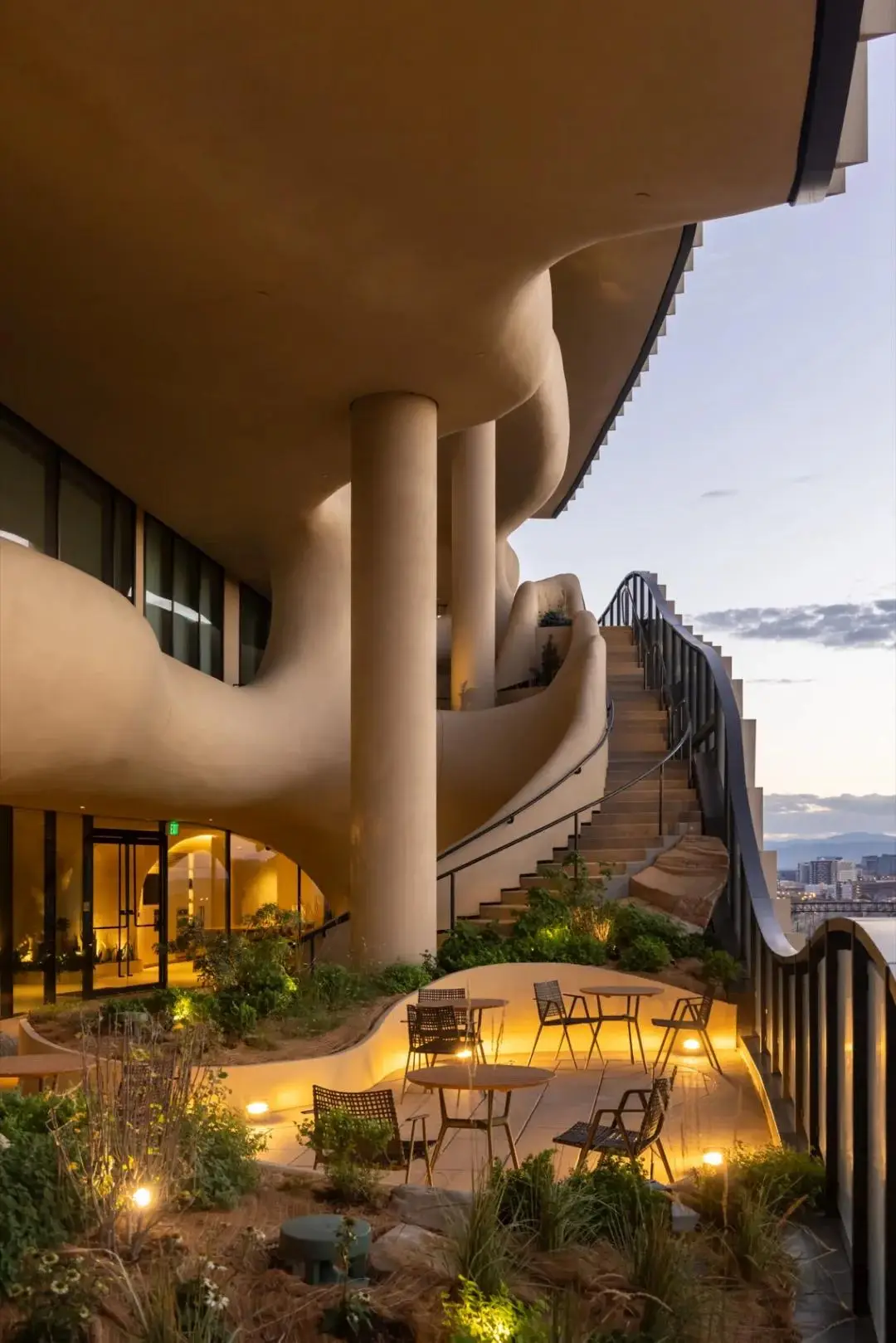 “裂缝”沿着大楼直上,可到达约630平方米的屋顶景观露台。这个以高山台地为灵感的空间设有游泳池、水疗中心和户外花园,也可一览落基山脉和丹佛天际线。“垂直峡谷”解决了丹佛市对高密度城市住宅的需求,同时为居民提供舒适、自然的户外交流场所。