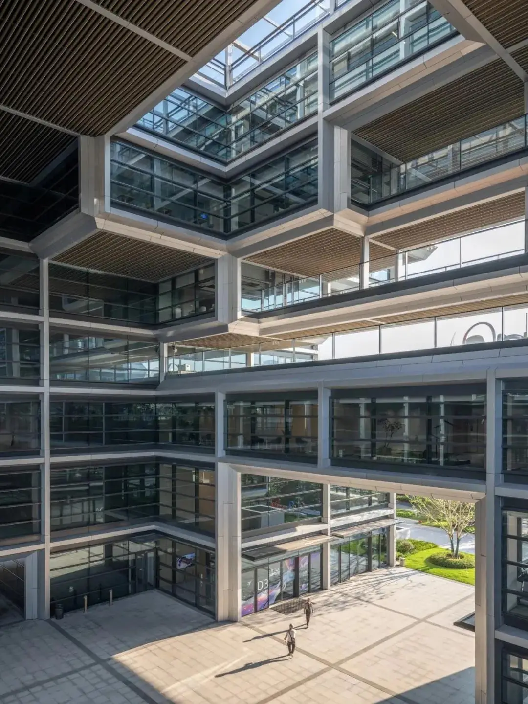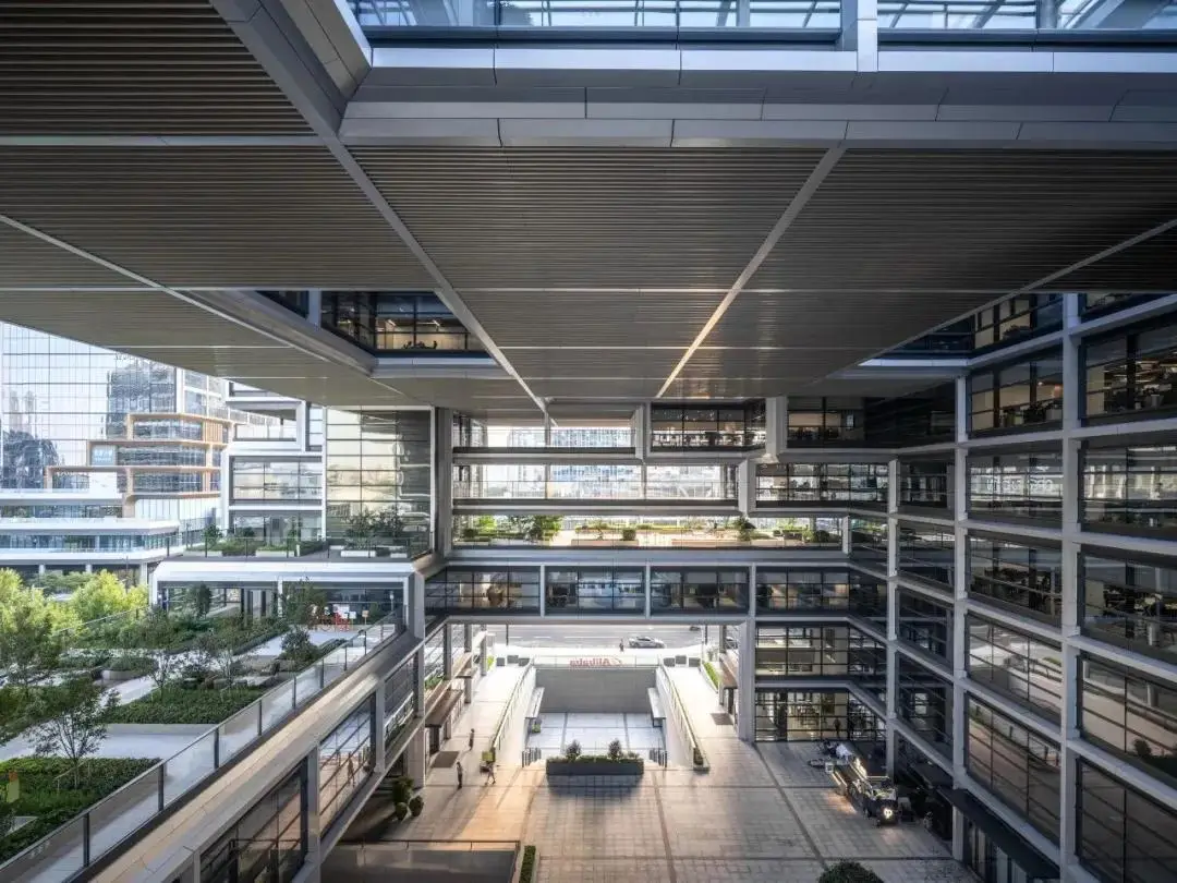 办公大楼围绕中心开放式大型公共空间进行布局,邀请人们进入其中。这一设计营造出活跃的社交中心,可以通往建筑主入口,其上方还设有可俯瞰中央广场的观景露台。建筑整体相当通透,既让人们可以从外部一睹阿里巴巴的内部世界,也保留了从内部向外观景的良好视野。众多室外露台为日常社交和各类活动提供了理想场地。多样化的楼层平面设置,增强了整个建筑的灵动性。